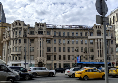 Воздвиженка, 4/7 стр.1. Бывшая гостиница «Петергоф». Первые три этажа построены в 1877 г., четвёртый — в 1902 г. Архитектор В.В.Шауб. В дни восстания 1905 г. здесь жил А.М.Горький. В 1913–1919 гг. здесь жил Л.В.Собинов. Объект культурного наследия регионального значения (фото 19.01.23)