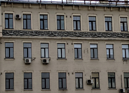 Воздвиженка, 3/5 стр.2–6. Медальоны с портретами Архимеда, Коперника, Галилея, Ньютона, Ломоносова, Дарвина, Менделеева, Тимирязева, Павлова, Руставели выполнила Н.В.Крандиевская. Портреты писателей Пушкина, Лермонтова, Гоголя, Белинского, Герцена, Шевченко, Некрасова, Чернышевского, Добролюбова, Салтыкова-Щедрина, Тургенева, Толстого, Маяковского, Горького создал скульптор С.Е.Евсеев (фото 19.01.23)