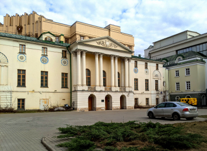 Знаменка, 12/2 стр.3. Усадебный дом построен при графе Апраксине в 1701–1742 г.г. В начале 1760-х г.г. усадьба перешла к графу Р.Воронцову. В 1782 г. дом перестроен по проекту архитектора М.Ф.Казакова. Объект культурного наследия федерального значения. Сейчас Московская средняя специальная музыкальная школа им.Гнесиных (фото 20.07.19)