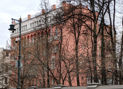 Романов пер., 2/6 стр.2. Больница Управления делами Президента РФ. Здание перестроено в 1929 г. Архитектор Н.В.Гофман-Пылаев. В основе доходный дом Шереметевых, построенный в 1877–1902 г.г. Архитекторы Серебряков, А.Ф.Мейснер. Объект культурного наследия регионального значения (фото 12.04.24)