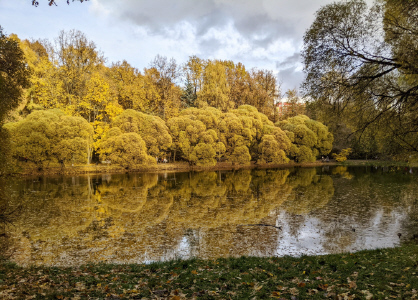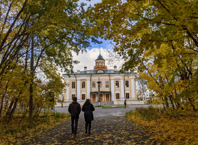 Ворошиловский парк, 5. Усадьба Нарышкиных. Архитектурный ансамбль усадьбы в общих чертах сложился к концу XVIII в., когда на возвышенном месте был выстроен деревянный дом в стиле раннего классицизма, в 1820 — 1830-х гг. дополненный оформившими пространство парадного двора флигелями в стиле ампир. Объект культурного наследия федерального значения (фото 12.10.25)