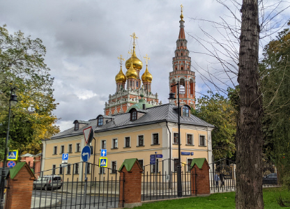 М.Толмачёвский пер., 9. Храма Николы в Толмачах. Здание церкви было построенно в 1690—1697 г.г. на средства жителей Кадашёвской слободы - Кондратия и Лонгина Добрыниных. Трапезная и колокольня в ампирных формах возведены в 1833-34 гг. по проекту архитектора Ф.М.Шестакова.