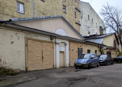 Потаповский пер., 8/12 стр.5. Каретный сарай и конюшня усадьбы Головиных. Построено в конце XVIII в., в начале XIX в. пристроена вторая часть. Объект культурного наследия федерального значения (фото 25.10.25)