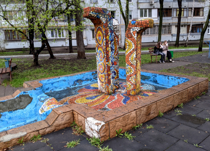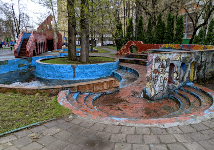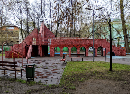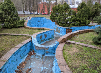 Новоалексеевская ул., 18 к.2. Детская площадка. Оригинальный двор спроектировали и построили в 1977 году студенты МАрхИ на средства завода «Водоприбор». Его достопримечательностями стали фонтан с системой бассейнов, мозаичный амфитеатр и «красная крепость» — уменьшенная копия акведука. Однако, фонтан с бассейном перестали работать с начала 1990-х, когда завод прекратил его обслуживание. (фото 15.04.26)