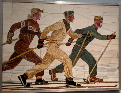 Лыжники, 1950 г. Мрамор, флорентийская мозика. Курская картинная галлерея