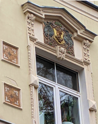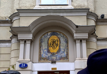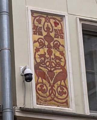 Мясницкая ул., 24/1. Над входом во внутренний корпус сохранилось керамическое панно с вензелем Строгановского училища, выполненное по рисунку Ф.Ф.Федоровского (фото 27.10.25)