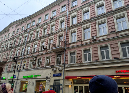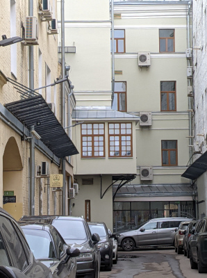 Мясницкая ул., 10 стр.1. Доходный дом Вятского архиерейского подворья. Предположительно в 1780–1790-е гг., когда подворье находилось в аренде у московского купца И.М.Волченкова, был построен каменный двухэтажный с подвалом доходный корпус, нижний этаж которого был занят погребами, средний — лавкой, харчевней, калашной избой, а верхний — жилыми покоями (фото 18.03.24)
