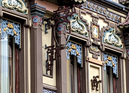 Мясницкая ул., 19. Чайный дом Перлова. Построен в 1890 г., архитектор — Р.И.Клейн. В 1896 г. переоформлен К.К.Гиппиусом в китайском стиле. Потомки Перловых обратились к мэру с просьбой о передаче им фамильного дома в аренду. И ныне созданное ООО «Перловы и К» возглавила правнучка С.Перлова, Ж.Ю.Киртбая. Она поставила две задачи: восстановить исторический облик здания и возобновить фамильное дело — чаеторговлю (фото 18.03.24)