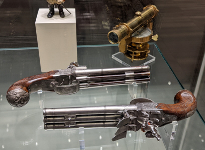 Пара кремниевых трехствольных пистолетов. Мастера Дж.Гриффин и Дж.Тоу, Лондон, 1770-1787 г.г. Сталь, серебро, орех