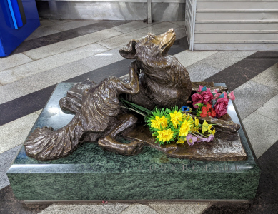 Новослободская ул., 16. «Сочувствие» — памятник, посвящённый гуманному отношению к бродячим собакам, который находится между входом и выходом станции московского метро «Менделеевская». Установлен в 2007 г. (фото 18.10.25)
