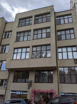 Б.Спасоглинищевский пер., 8. Жилой дом правления „Текстильстрой“. Построен в 1927-1928 г.г. по проекту архитектора А.М.Крылова. Ценный градоформирующий объект. С 1935 по 1965 г. в этом доме жил учёный-палеонтолог, писатель-фантаст И.А.Ефремов (1908-1972) (фото 20.08.25)