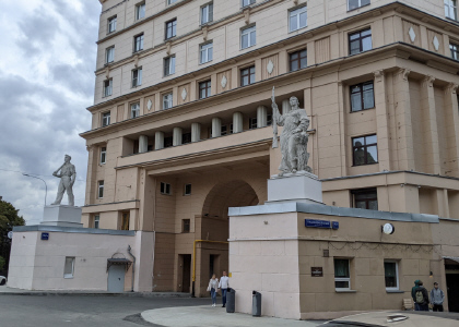Подколокольный пер., 16/2. Этот помпезный дом в стиле соцреализма был построен в 1936 г. по проекту архитектора И.А.Голосова (1883-1945). По сторонам большой арки можно увидеть статуи того времени - рабочего с отбойным молотком и колхозницы с винтовкой и со снопом (скульптор А.М.Лавинский). Арку со статуями можно увидеть во многих отечественных фильмах. Например, "Покровские ворота", "Розыгрыш", "Холодное лето 53-го". Здесь живёт известный певец Валерий Сюткин.